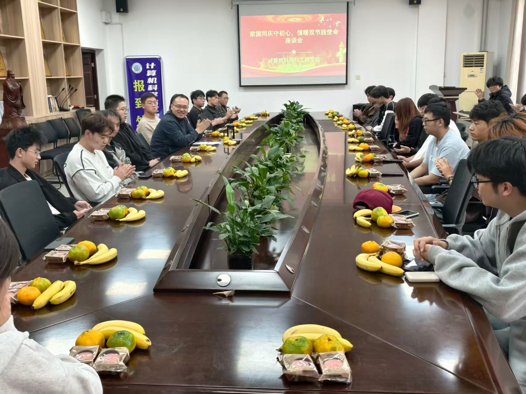 金秋送爽,丹桂飘香,当中秋的团圆温情与国庆的庄严豪迈欣然相逢,计算机科学与工程学院借双节契机,于10月6日下午精心举办了“家国同庆守初心,情暖双节践使命”主题座谈会。学院党委副书记杨朝与各年级学生代表齐聚一堂,在温馨欢乐的氛围中,共话家国情怀,共叙使命担当。