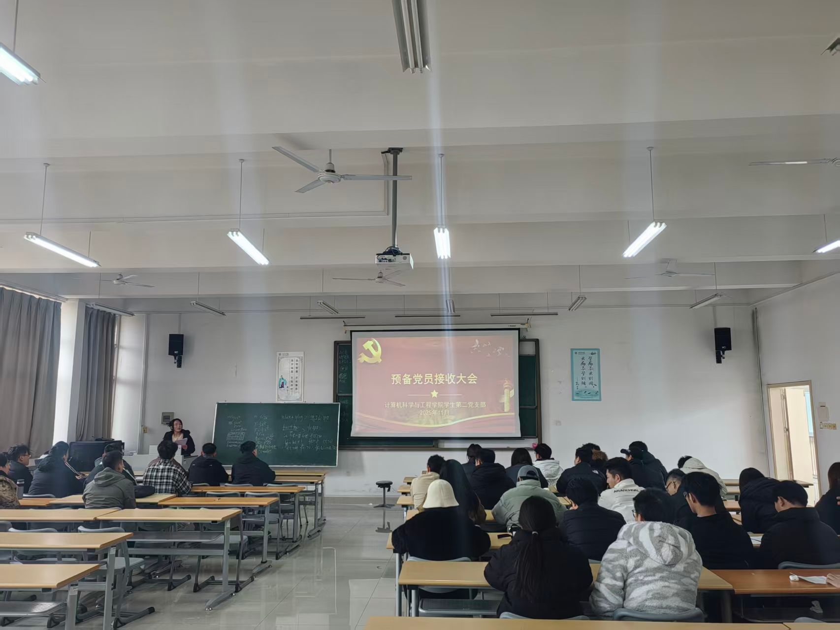 2025年11月17日下午,计算机科学与工程学院学生第二党支部在B2#413教室召开中共预备党员接收大会。会议由计算机科学与工程学院学生第二党支部书记崔凤玲主持,支部委员陈庆成、沙振明出席,支部全体学生党员及6名发展对象参与。
