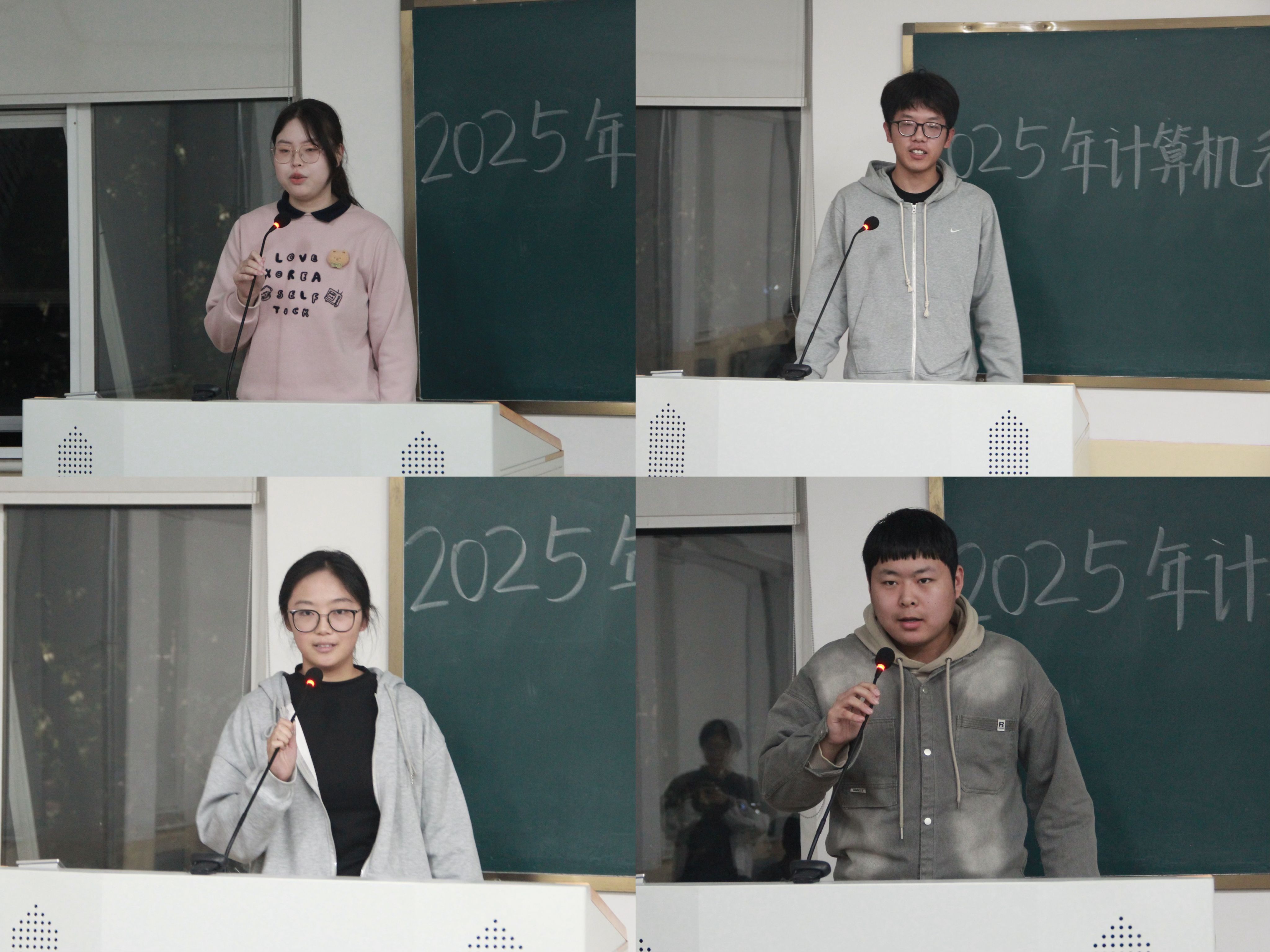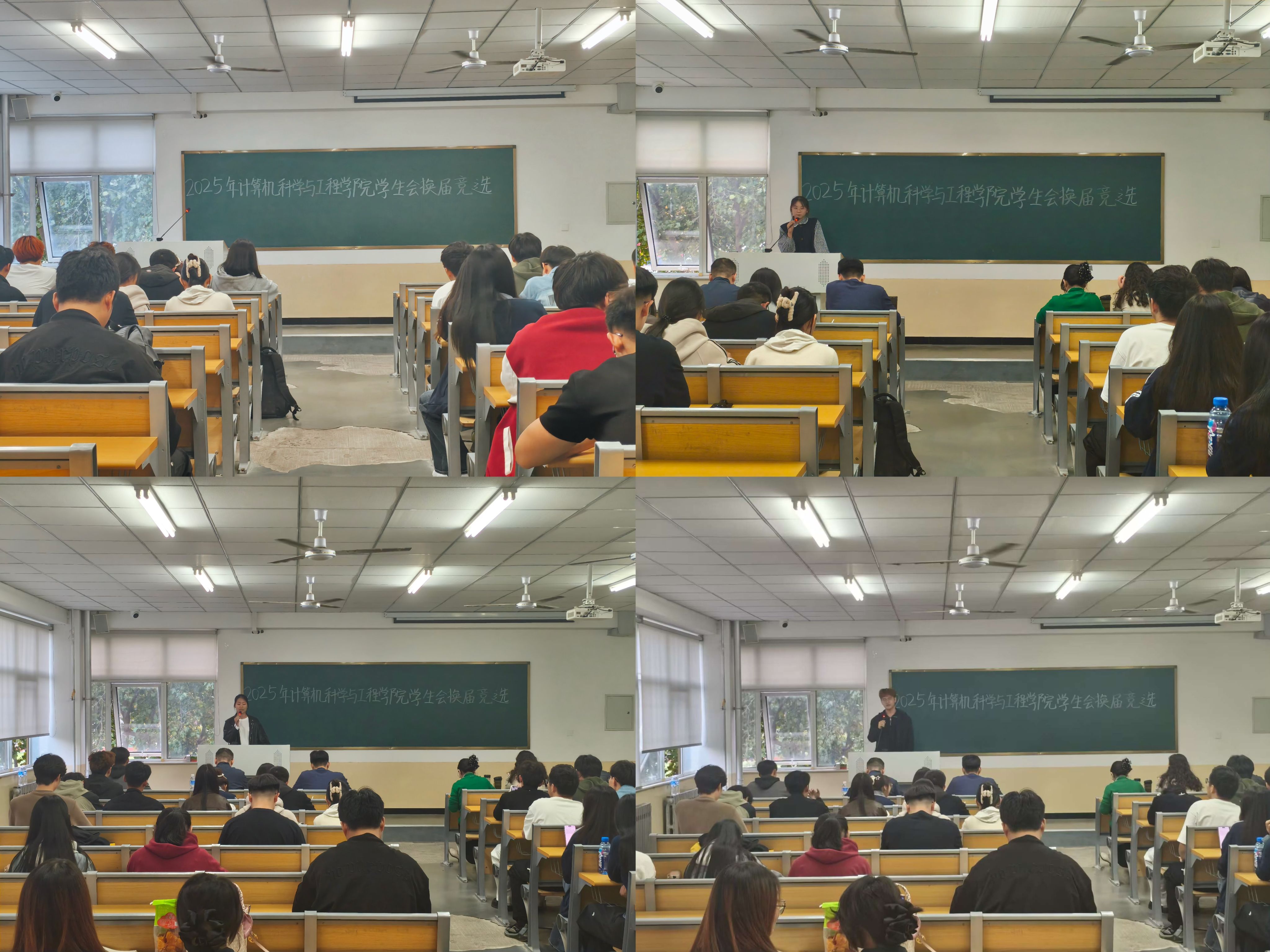 为推进学生工作高质量发展,完善学生干部梯队建设,10月14日下午,计算机科学与工程学院在8A201教室举行2025年学生组织换届竞选大会。学院党委副书记杨朝、团委书记范建田、团委副书记李德法及学院辅导员组成评审团出席本次大会,院自律会主席毛涵担任主持。