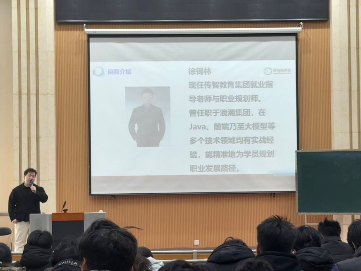 为帮助本科生把握学科前沿脉络、规划学业与职业发展路径,12月18日下午,计算机科学与工程学院于8B103教室举办AI与虚拟现实主题学科前沿讲座。传智教育集团就业指导老师、职业规划师徐锡林应邀主讲,学院近170名2025级本科生到场参会。